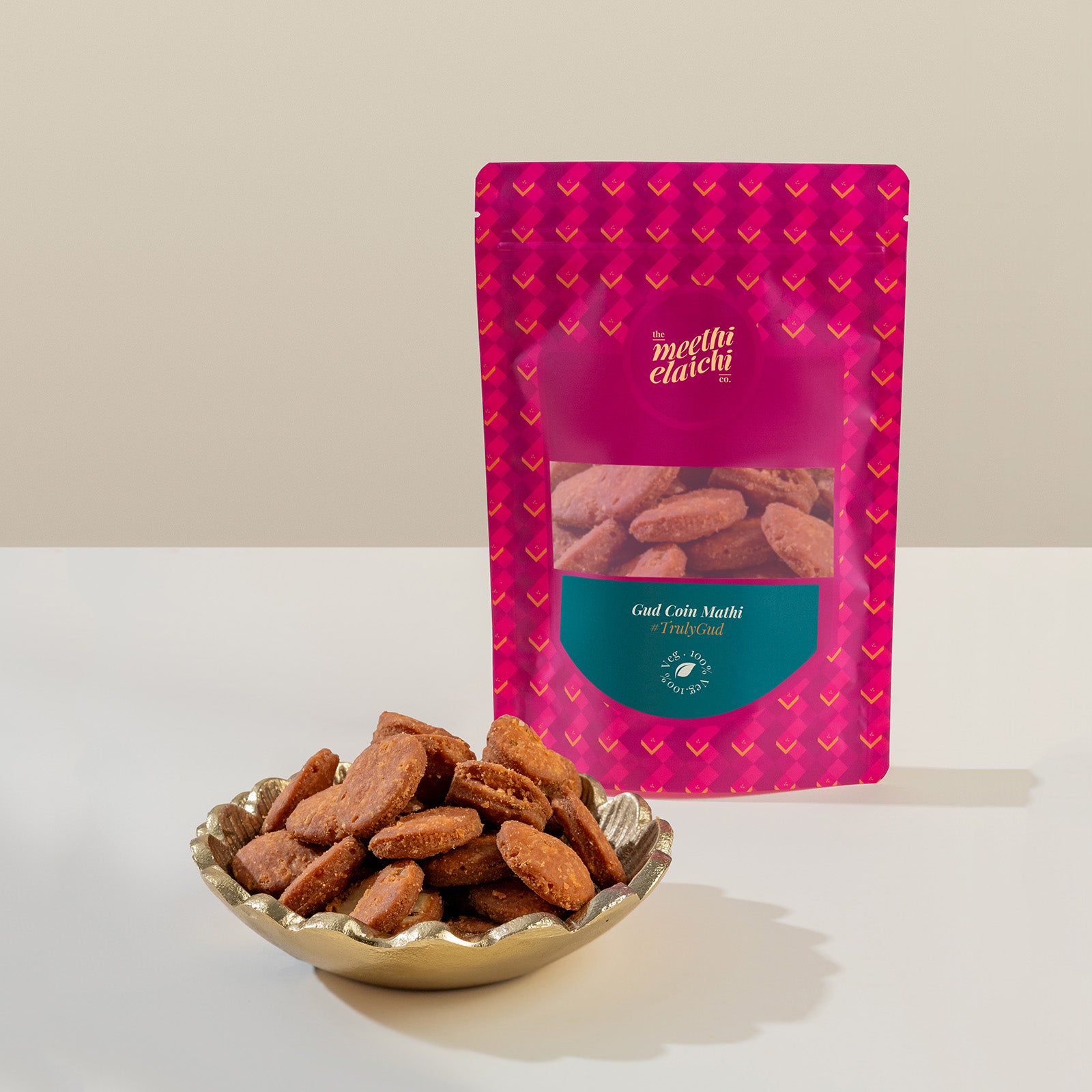 Our Gud Coin Mathi, a delightful fusion of crispy texture and natural sweetness. Made with premium flour and pure jaggery (gud), these bite-sized mathis bring you the warmth of homemade flavor with a festive twist.